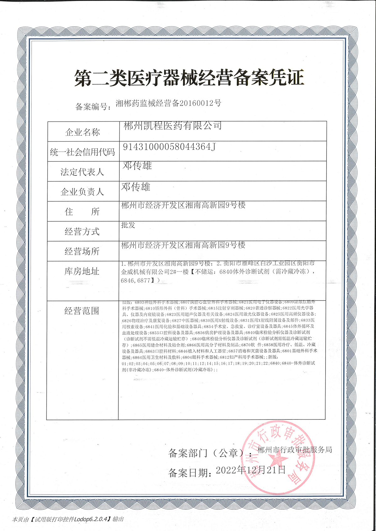 第二類醫(yī)療器械經(jīng)營備案憑證:湘郴藥監(jiān)械經(jīng)營備20160012號